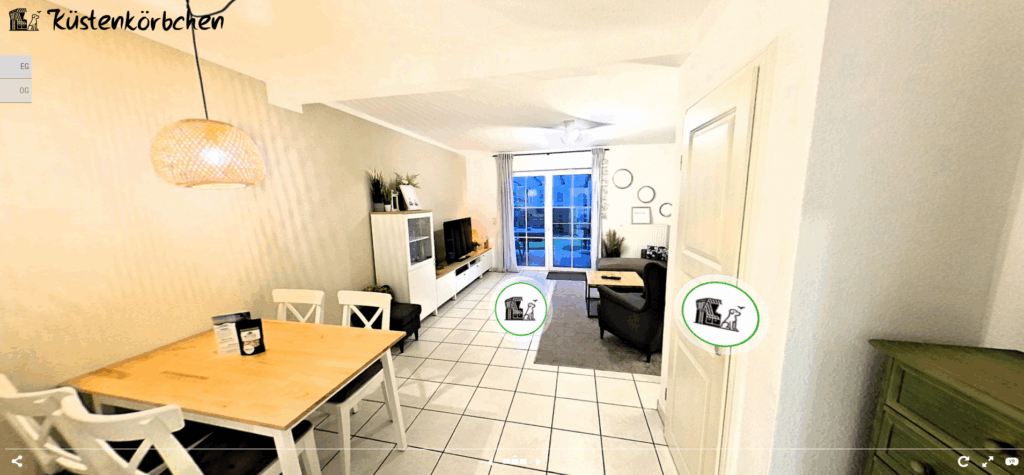 Fokussiert auf den Urlaub mit Hunde(en) haben wir unser Küstenkörbchen gestaltet. Neben einem geräumigen Wohn-Essbereich findest du im EG eine gut ausgestattete Einbauküche mit Geschirrspülmaschine, Ofen, Herd, Mikrowelle und Kühlschrank. Außerdem befindet sich im Eingangsbereich ein Windfang, über den ihr die Geraderobe und das Gäste-WC erreicht. Vom Sofa aus schaut ihr durch die Fliegengittertür auf die überdachte Terrasse, die an den komplett eingezäunten Garten Grenzt, sowie in eine ruhig gelegene Nachbarschaft.